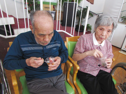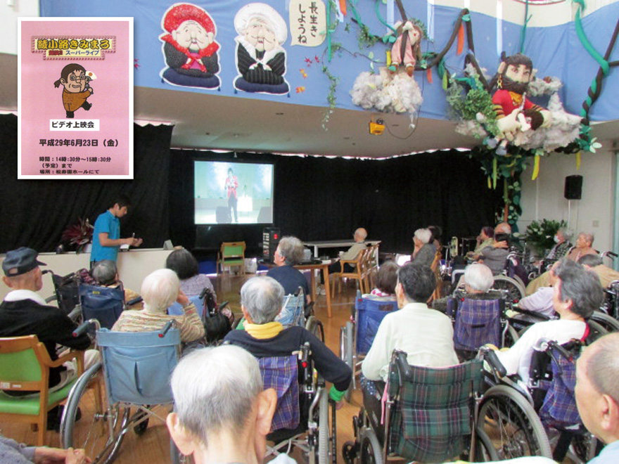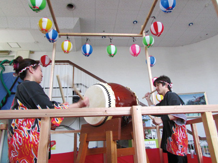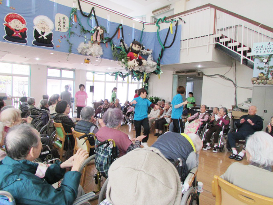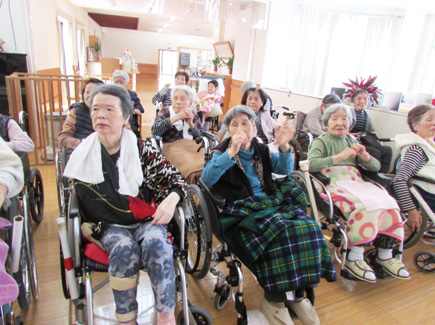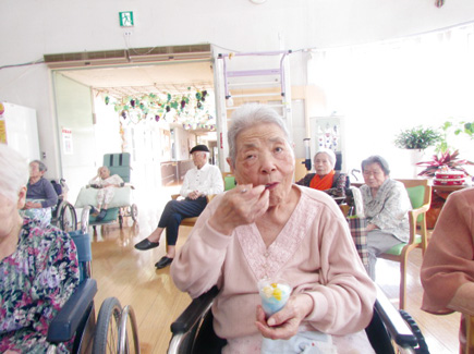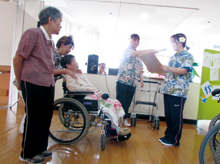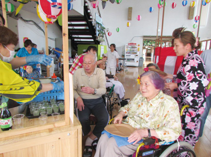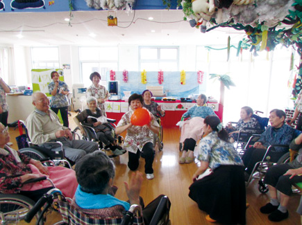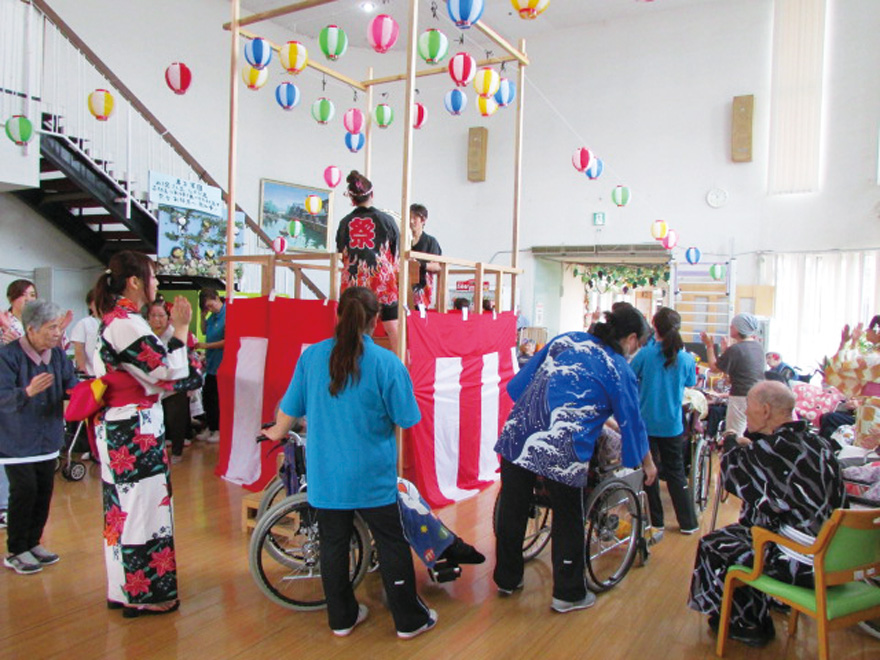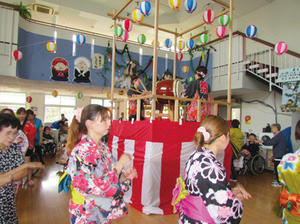 利用者様、ご家族様、浴衣やはっぴを着た職員達が炭坑節を踊り、やぐらの上には太鼓がリズムよく鳴り響いています。 ハイビスカスの髪飾りをした利用者様達の笑顔でいっぱいになりました。