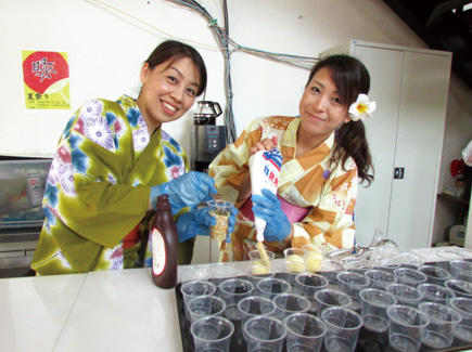 中庭では焼き鳥、焼きそば、ポテト。ホールでは、ジュース、ところてん、そうめん、サンデー。