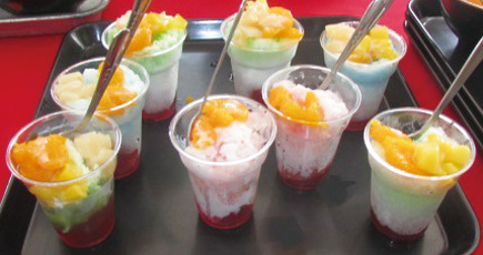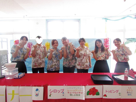 汗をかいた後は、フルーツ・あんこ・抹茶などでカラフルにトッピングしたハワイアンかき氷が振る舞われ、とても美味しそうに食べられていました。 |